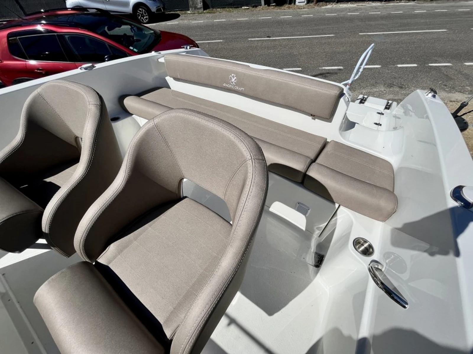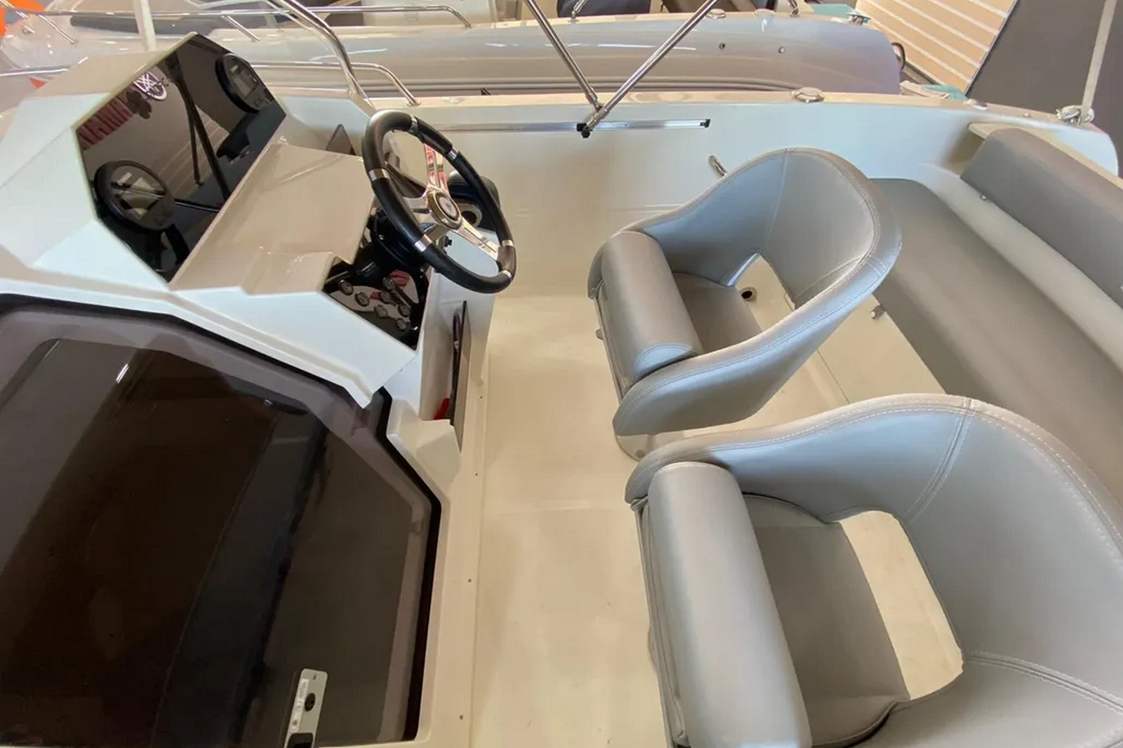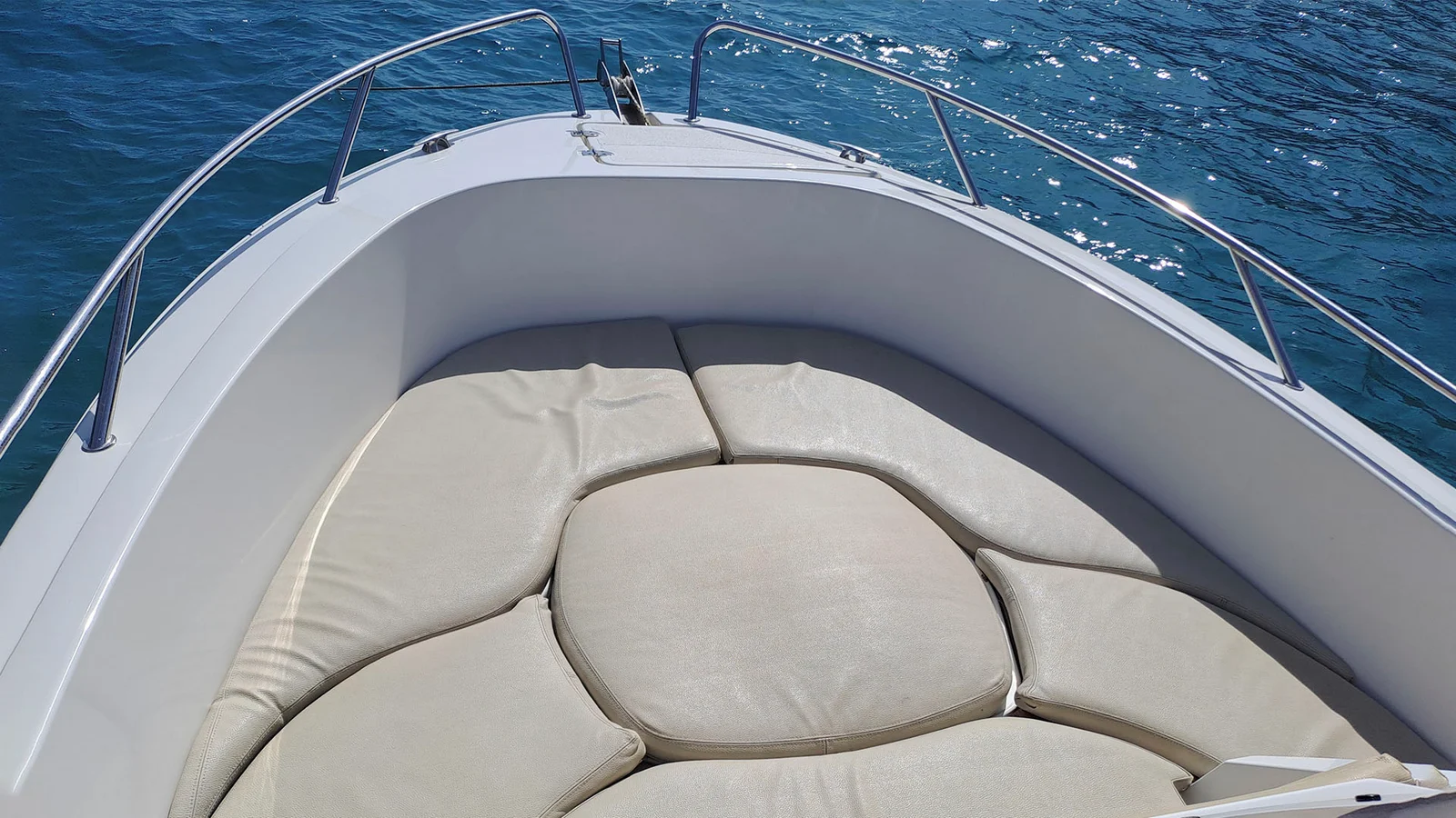 Sin duda, el modelo más completo de su categoría, cuenta con una buena zona de solarium en la proa, una cabina, amplias plataformas de baño con gran escalera y ducha de cubierta, así como un toldo bimini para protegerse del sol, un ancla con molinete eléctrico, una radio/bluetooth, y por supuesto todo el equipo de seguridad (chalecos salvavidas, bocina...).